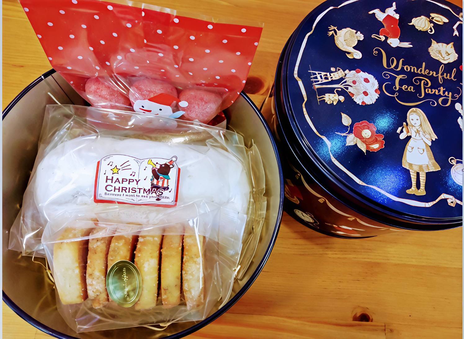 お菓子のミカタのアリス缶に、ドイツの伝統的なフルーツたっぷりのパン菓子、シュトーレンと、モンガトウオリジナルのお菓子を3種類詰めました。